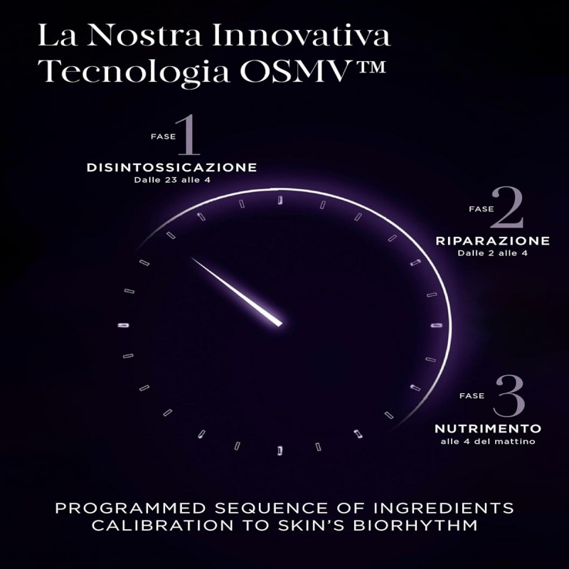 • Principi attivi altamente concentrati - utilizza la tecnologia OSMV per erogare con precisione principi attivi altamente concentrati e potenti in una sequenza di rilascio programmata e sincronizzata con il ritmo circadiano della pelle, in grado di disintossicarla, ripararla e rigenerarla in modo naturale durante il sonno.